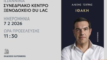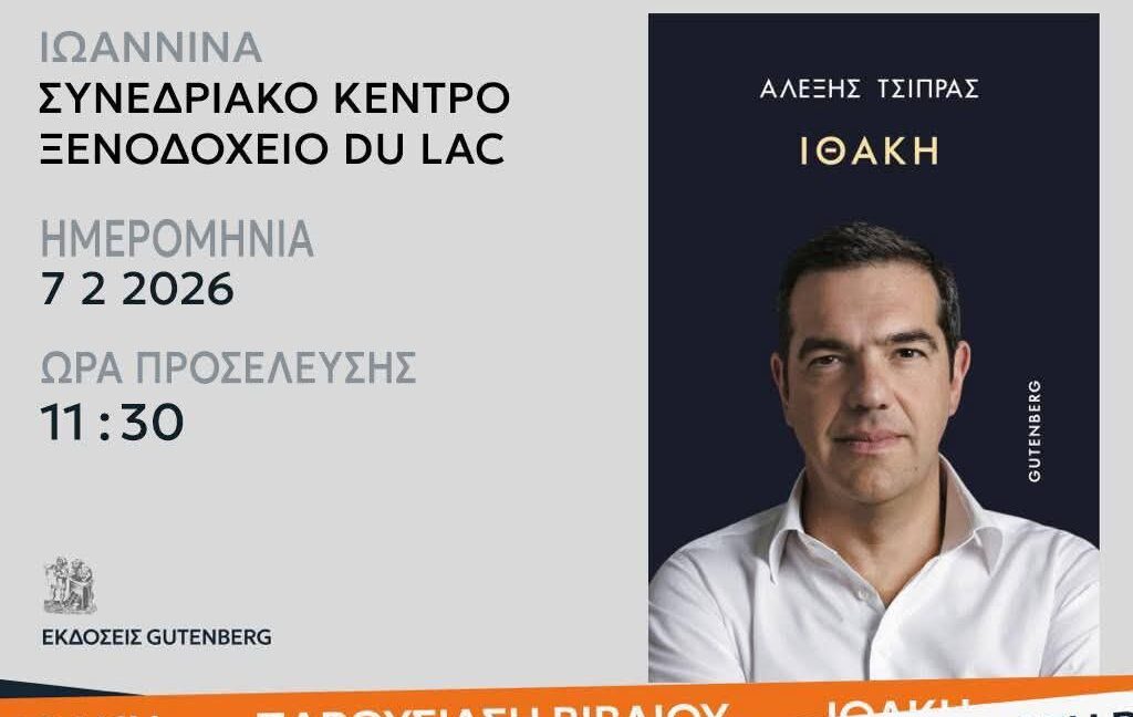 Σάββατο 7 Φεβρουαρίου στα Ιωάννινα στο Συνεδριακό κέντρο – Ξενοδοχείο Du Lac (Κ. Παπούλια & Ίκκου, Ιωάννινα) παρουσίαση του βιβλίου – ΙΘΑΚΗ του Αλέξη Τσίπρα