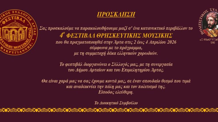 in Άρτα, Πολιτισμός & Παιδεία ΜΑΚΡΥΓΙΑΝΝΗΣ ΣΥΛΛΟΓΟΣ-Πρόσκληση στο 4ο Φεστιβάλ Θρησκευτικής Μουσικής Άρτας