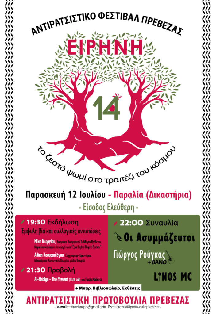 Είμαστε εδώ να φωνάξουμε, να συζητήσουμε και να γιορτάσουμε στο φεστιβάλ μας. Ραντεβού την Παρασκευή 12 Ιουλίου, στην Παραλία της Πρέβεζας (Δικαστήρια), στις 19:30 για το 14ο Αντιρατσιστικό Φεστιβάλ!