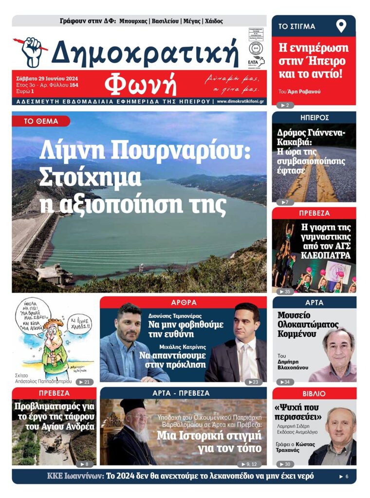 in Εφημερίδα, Ηπειρώτικος Καθρέφτης Πρωτοσέλιδο – 165ο Φύλλο – Δημοκρατική Φωνή – 6/7/2024 8 Ιουλίου 2024, 16:51 See more Προηγούμενο άρθρο Συνάντηση του Δημάρχου Αρταίων με τις Αθλήτριες του «ΑΣ ΠΥΡΡΟΣ» Άρτας πριν από τους 3ους Βαλκανικούς Αγώνες Αισθητική Ομαδικής Γυμναστικής στη Σόφια Επόμενο άρθρο Παρέμβαση του Βουλευτή Άρτας ΝΔ Γιώργου Στύλιου για την ομαλή λειτουργία της ΜΕΘ του Νοσοκομείου Άρτας