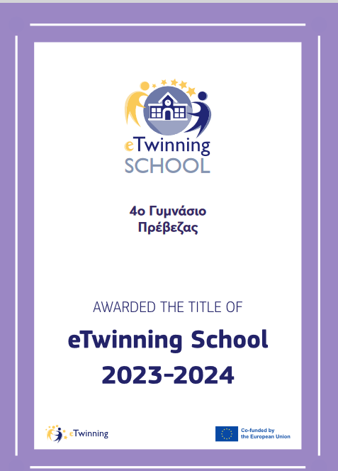To 4o Γυμνάσιο Πρέβεζας είναι το μοναδικό σχολείο Πρωτοβάθμιας και Δευτεροβάθμιας Εκπαίδευσης του Νομού Πρέβεζας και μεταξύ ΜΟΝΟ άλλων 3 σχολείων από την Περιφέρεια Ηπείρου (Πρότυπο Λύκειο Ζωσιμαίας Ιωαννίνων, 2ο Γυμνάσιο Διαπολιτισμικκής Εκπαίδευσης, και 18ο Νηπιαγωγείο Ιωαννίνων) και ανάμεσα σε 132 σχολεία από ολόκληρη τη χώρα που βραβεύτηκε για μια διετία ακόμη με την ετικέτα του ETwinning School Label .