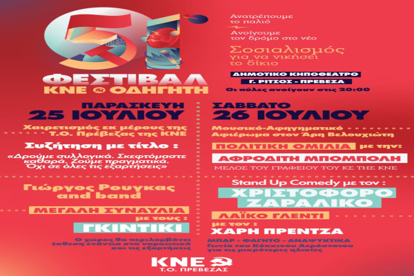 Σύντομα ανοίγουν οι πύλες του 51ου Φεστιβάλ ΚΝΕ – Οδηγητή και στη πόλη μας. Στις 25 και 26 Ιουλίου, στο Δημοτικό Κηποθέατρο, κάνει στάση ο μεγαλύτερος πολιτικός και πολιτισμικός θεσμός της χωράς, με σύνθημα «Ανατρέπουμε το παλιό, ανοίγουμε το δρόμο στο νέο. Σοσιαλισμός για να νικήσει το δίκιο!»