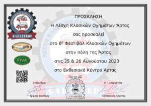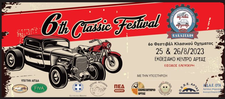 Η Λέσχη Κλασικών Οχημάτων Άρτας, προσκαλεί όλους του λάτρεις των κλασικών μοτοσικλετών και των κλασικών αυτοκινήτων, στο 6ο Φεστιβάλ Κλασικών Οχημάτων που θα πραγματοποιηθεί στην Άρτα και πιο συγκεκριμένα στο εκθεσιακό κέντρο της Άρτας την Παρασκευή 25 και στο Σάββατο 26 Αυγούστου το απόγευμα.