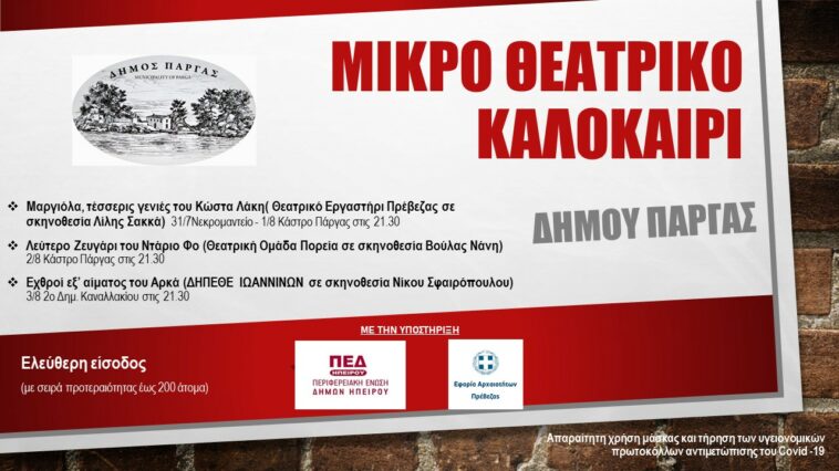 Ο Δήμος Πάργας διοργανώνει θεατρικές παραστάσεις για τέσσερις συνεχόμενες ημέρες από την 31η Ιουλίου έως τις 3 Αυγούστου και φέρνει το θέατρο κοντά στο δημότη με ελεύθερη είσοδο για όλους. Αυτό είναι το πρώτο βήμα για την καθιέρωση ενός μόνιμου καλοκαιρινού φεστιβάλ θεάτρου.