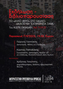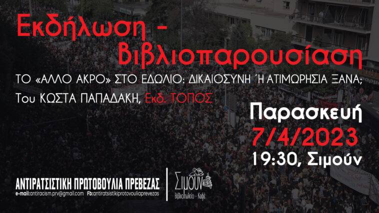 Την Παρασκευή 7 Απριλίου η Αντιρατσιστική Πρωτοβουλία Πρέβεζας σας καλεί στην εκδήλωση – βιβλιοπαρουσίαση για το βιβλίου του Κώστα Παπαδάκη με τίτλο «Το άλλο άκρο στο εδώλιο. Δικαιοσύνη ή ατιμωρησία ξανά; (Εκδόσεις “Τόπος”)».