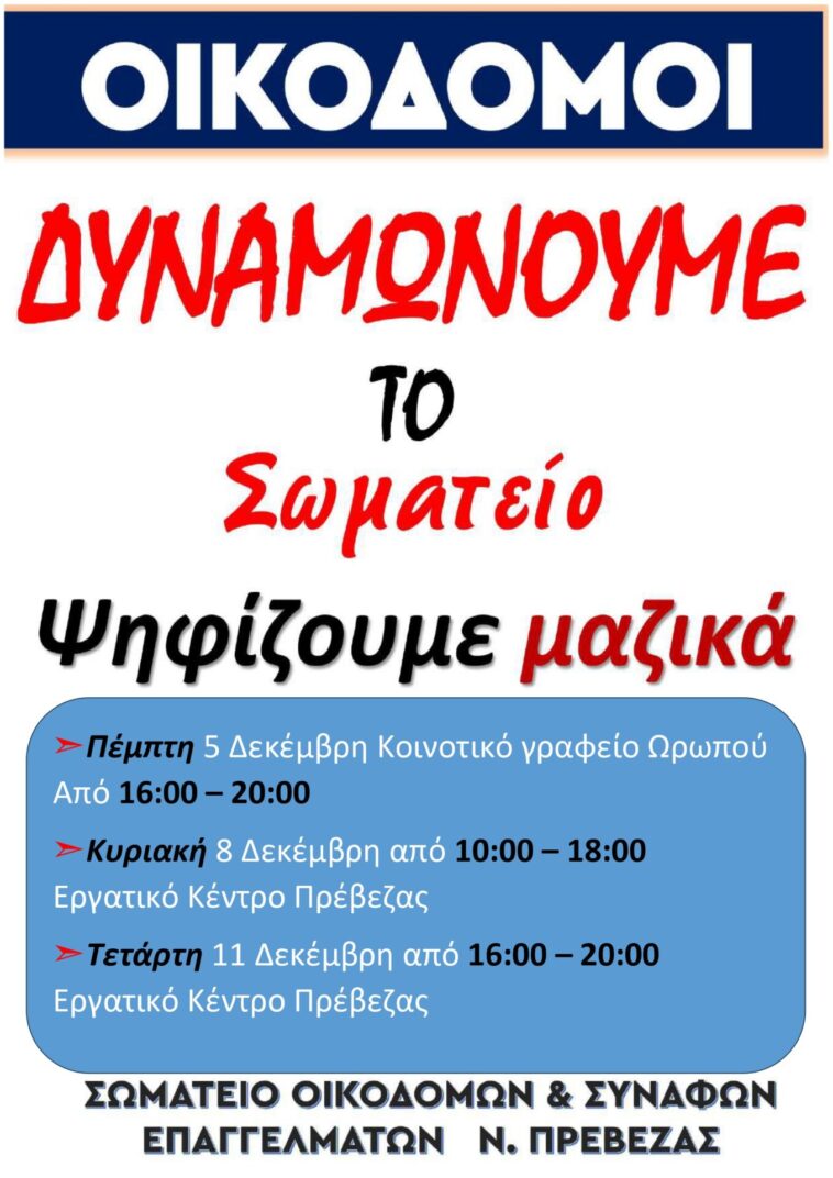 ➣Τετάρτη 11 Δεκέμβρη,16.00-20.00,στο Εργατικό Κέντρο Πρέβεζας.