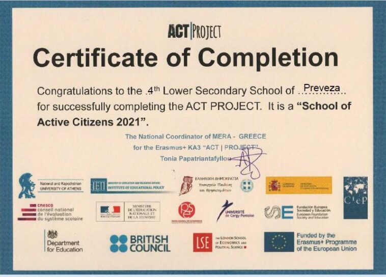Το 4ο Γυμνάσιο Πρέβεζας είναι ένα από τα συνεργαζόμενα σχολεία του Δικτύου που με τις δράσεις του προάγουν τους στόχους της ενεργής πολιτότητας με θέμα «Ενεργοί Πολίτες για το περιβάλλον και την κλιματική αλλαγή», Eco –Team –ΒΕ2 και συμμετείχε στη Σχολική Εβδομάδα Ενεργών Πολιτών: “ACT – ACTive citizenship που πραγματοποιήθηκε από τις 17-21/05/2021.