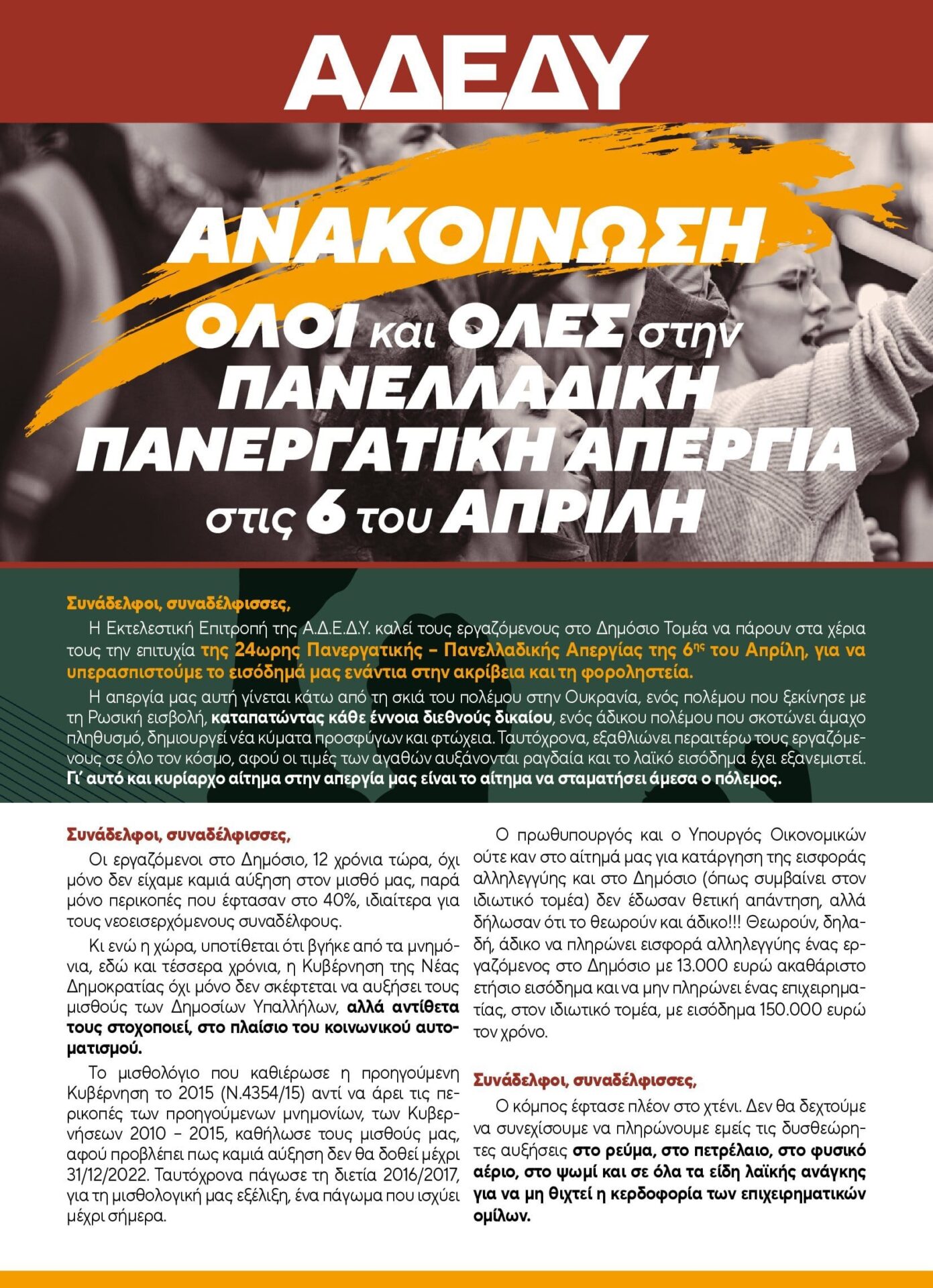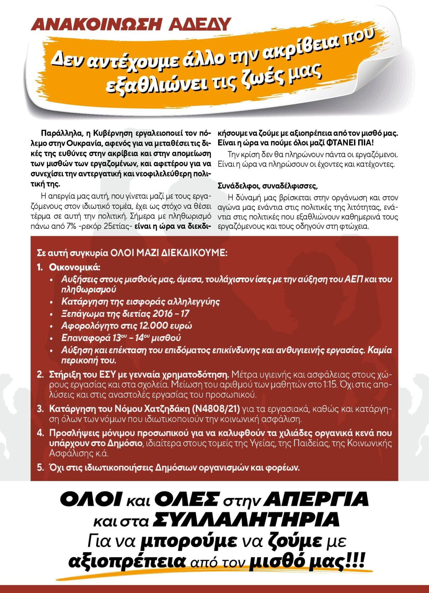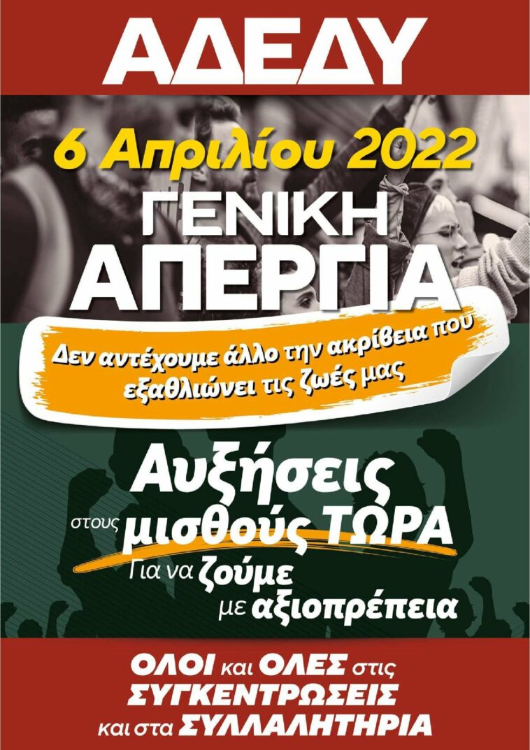 ΑΔΕΔΥ Νομαρχιακό Τμήμα Άρτας: Τετάρτη 6 Απρίλη 2022 – Πανδημοσιοϋπαλληλική Πανεργατική Απεργία – Μαζικά κατεβαίνουμε στην απεργία και στις απεργιακές συγκεντρώσεις