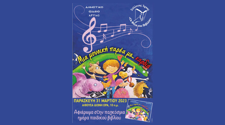 Με αφορμή την παγκόσμια ημέρα παιδικού βιβλίου, ο Σύλλογος «Οι φίλοι του βιβλίου» και το Δημοτικό Ωδείο Άρτας έχουν ετοιμάσει για τους μαθητές της πρωτοβάθμιας εκπαίδευσης του Νομού Άρτας, μια εκδήλωση, μια αφήγηση ενός παιδικού βιβλίου με συνοδεία παρουσίασης μουσικών οργάνων, με τίτλο, «Μια μουσική παρέα με…..καρδιά».