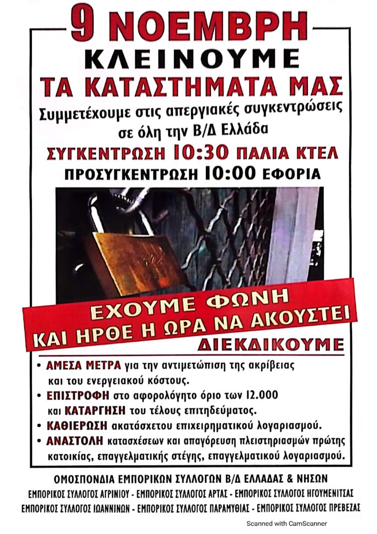 Απέναντι σε όλα αυτά, ο Σύλλογος μας όπως και άλλοι Εμπορικοί Σύλλογοι στην περιοχή μας, καθώς και η Ομοσπονδία Εμπορικών Συλλόγων Β/Δ Ελλάδας & Νήσων καλούμε σε μαζική συμμετοχή στις απεργιακές κινητοποιήσεις στις 9 Νοέμβρη! Να συμπορευτούμε με όσους έχουν τις ίδιες αγωνίες και προβλήματα με εμάς! Με τους εργαζόμενους, τους άνεργους, τους μικρομεσαίους αγρότες.