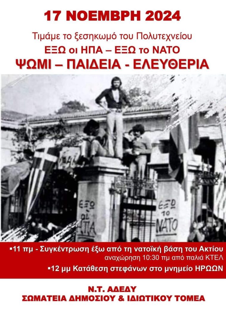 Συλλαλητήριο για τον ξεσηκωμό του πολυτεχνείου από το Ν.Τ της ΑΔΕΔΥ και σωματεία και φορείς Δημόσιου και Ιδιωτικού τομέα, 17 ΝΟΕΜΒΡΗ ΣΥΓΚΕΝΤΡΩΣΗ ΣΤΗ ΒΑΣΗ ΤΟΥ ΑΚΤΙΟΥ στις 11.00 (αναχώρηση στις 10.30 από τα παλιά ΚΤΕΛ) ΚΑΙ ΠΟΡΕΙΑ ΚΑΙ ΚΑΤΑΘΕΣΗ ΣΤΕΦΑΝΩΝ ΣΤΟ ΜΝΗΜΕΙΟ ΗΡΩΩΝ στις 12.00.