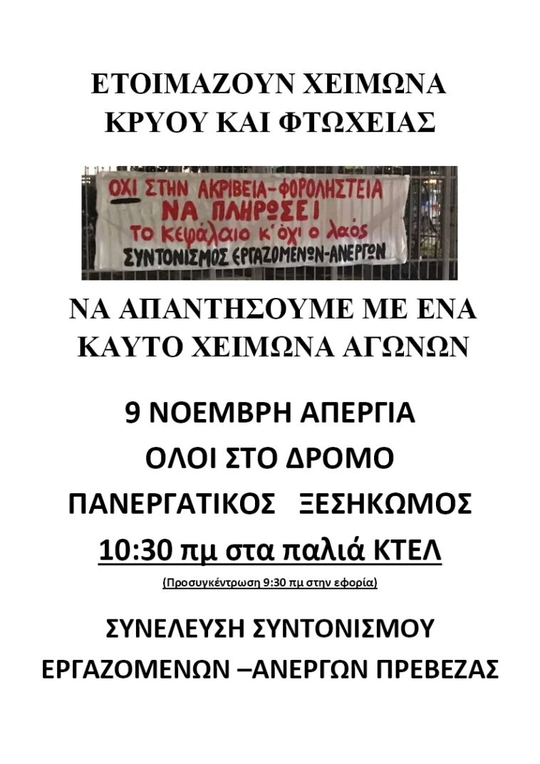 Η απεργία στις 9 Νοέμβρη αποτελεί μια οργανωμένη καθυστέρηση των ΓΣΕΕ-ΑΔΕΔΥ για να συμβάλλουν στην εκτόνωση της αγανάκτησης. Ο ρόλος του εργοδοτικού-κυβερνητικού συνδικαλισμού είναι βρώμικος. Να μην τους περάσει. H 9 Νοέμβρη να αποτελέσει ημέρα ρήξης και κλιμάκωσης του αγώνα. Να πάρουμε τους αγώνες στα χέρια μας . Δε θα μας λύσουν τα προβλήματα όλοι αυτοί που καλλιεργούν τη κοινοβουλευτική αναμονή. «Μαλαματίνα», COSCO, υγεία, ΛΑΡΚΟ, e-food, ναυτεργάτες, εκπαίδευση, φοιτητές και οι αντιστάσεις των σωματείων μας δείχνουνε το δρόμο. Όλα αυτά τα ρυάκια αντίστασης πρέπει να ενωθούν σε ένα χείμαρρο ανατροπής της πολιτικής της κυβερνητικής πολιτικής . Με την οργάνωση στους χώρους δουλειάς και τη συλλογική στάση ενάντια σε κάθε μικρό ή μεγάλο αντεργατικό μέτρο που η κυβέρνηση και η εργοδοσία θέλει να επιβάλει. Με τις συνελεύσεις, τις κινητοποιήσεις, την ταξική αλληλεγγύη και την ενότητά μας.