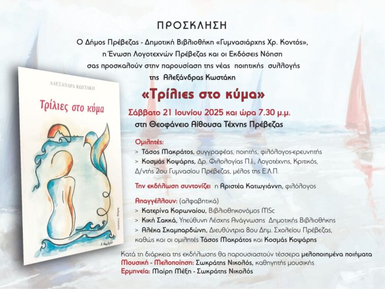 Η Ένωση Λογοτεχνών Πρέβεζας (Λογοτεχνική Στέγη) προσκαλεί τα μέλη της, τους φίλους της και τους πολίτες της Πρέβεζας, να παρευρεθούν στην παρουσίαση της νέας ποιητικής συλλογής «Τρίλιες στο κύμα» της ποιήτριας, εκπαιδευτικού και μέλους του Δ.Σ. της Ε.Λ.Π. Αλεξάνδρας Κωστάκη. Η εκδήλωση θα πραγματοποιηθεί το Σάββατο 21 Ιουνίου 2025, στις 7:30 μ.μ., στη Θεοφάνειο Αίθουσα Τέχνης στην Πρέβεζα. Για το βιβλίο θα μιλήσουν οι: Τάσος Μακράτος (συγγραφέας, ποιητής, φιλόλογος-ερευνητής) και Κοσμάς Κοψάρης (Δρ. Φιλολογίας Π.Ι., λογοτέχνης, κριτικός, Διευθυντής 2ου Γυμνασίου Πρέβεζας, μέλος της Ε.Λ.Π.). Την εκδήλωση θα συντονίσει η Φιλόλογος Αριστέα Κατωγιάννη. Ποιήματα της συλλογής θα απαγγείλουν η Κατερίνα Κορωναίου (Βιβλιοθηκονόμος MSc), η Κική Σακκά (Υπεύθυνη Λέσχης Ανάγνωσης της Δημοτικής Βιβλιοθήκης) και η Αλέκα Σκαμπαρδώνη (Διευθύντρια 8ου Δημοτικού Σχολείου Πρέβεζας), καθώς και οι ομιλητές της εκδήλωσης Τάσος Μακράτος και Κοσμάς Κοψάρης. Κατά τη διάρκεια της εκδήλωσης θα παρουσιαστούν τέσσερα μελοποιημένα ποιήματα σε μουσική/μελοποίηση του Σωκράτη Νικολού (καθηγητή μουσικής) και σε ερμηνεία της Μαίρης Μέξη και του Σωκράτη Νικολού. Την εκδήλωση συνδιοργανώνουν ο Δήμος Πρέβεζας-Δημοτική Βιβλιοθήκη «Γυμνασιάρχης Χρ. Κοντός», η Ένωση Λογοτεχνών Πρέβεζας και οι Εκδόσεις «Νόηση».