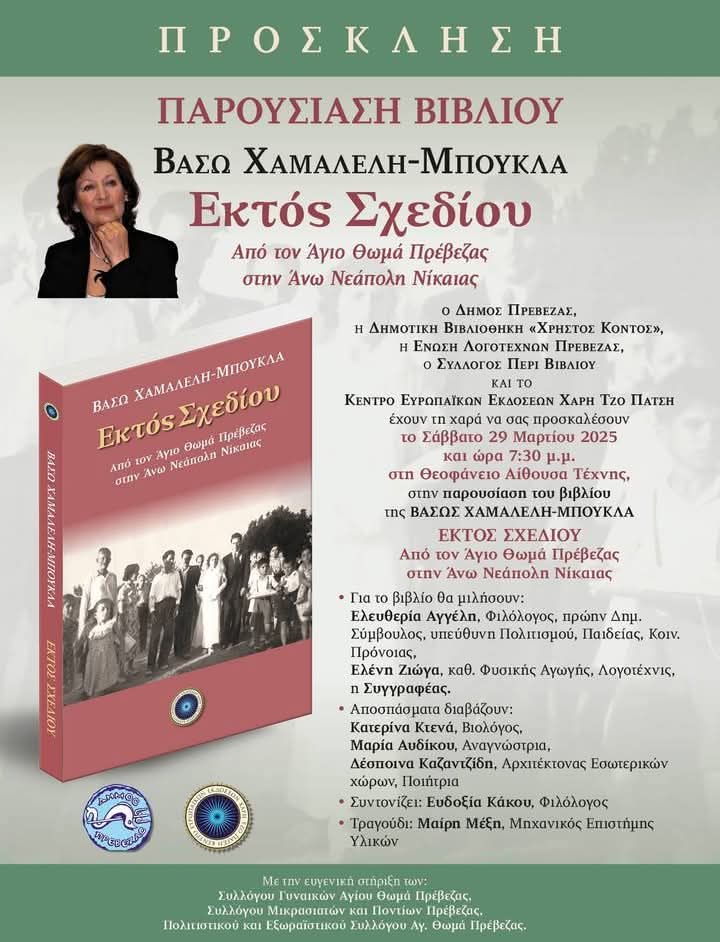 Η Ένωση Λογοτεχνών Πρέβεζας (Λογοτεχνική Στέγη) προσκαλεί τα μέλη της, τους φίλους της και τους πολίτες της Πρέβεζας, να παρευρεθούν στην παρουσίαση του νέου βιβλίου της συγγραφέως και ποιήτριας Βάσως Χαμαλέλη-Μπούκλα με τίτλο «Εκτός Σχεδίου». Για το βιβλίο θα μιλήσουν η Ελευθερία Αγγέλη, φιλόλογος, πρώην Δημοτική σύμβουλος (υπεύθυνη Πολιτισμού, Παιδείας, Κοιν. Πρόνοιας), η Ελένη Ζιώγα, καθ. Φυσικής Αγωγής, λογοτέχνης, και η συγγραφέας.