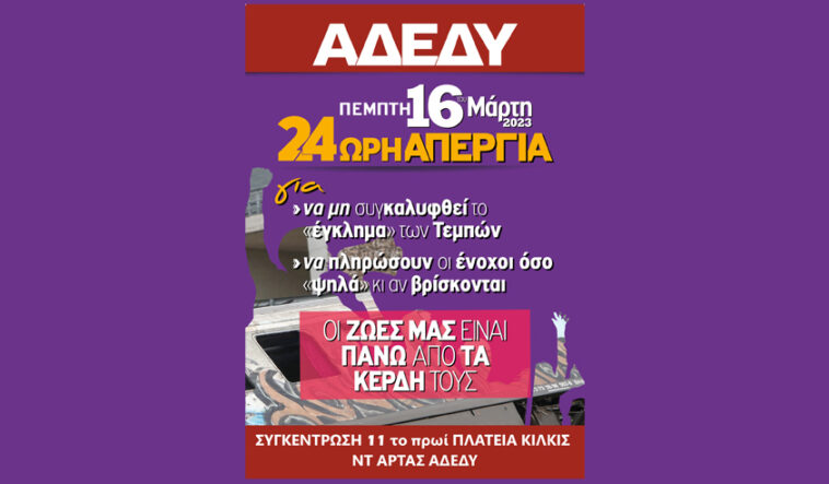 Την Πέμπτη 16 Μάρτη 2023 ΑΠΕΡΓΟΥΜΕ ΚΑΙ ΔΙΑΔΗΛΩΝΟΥΜΕ στις 11 το πρωί στην πλατεία ΚΙΛΚΙΣ
