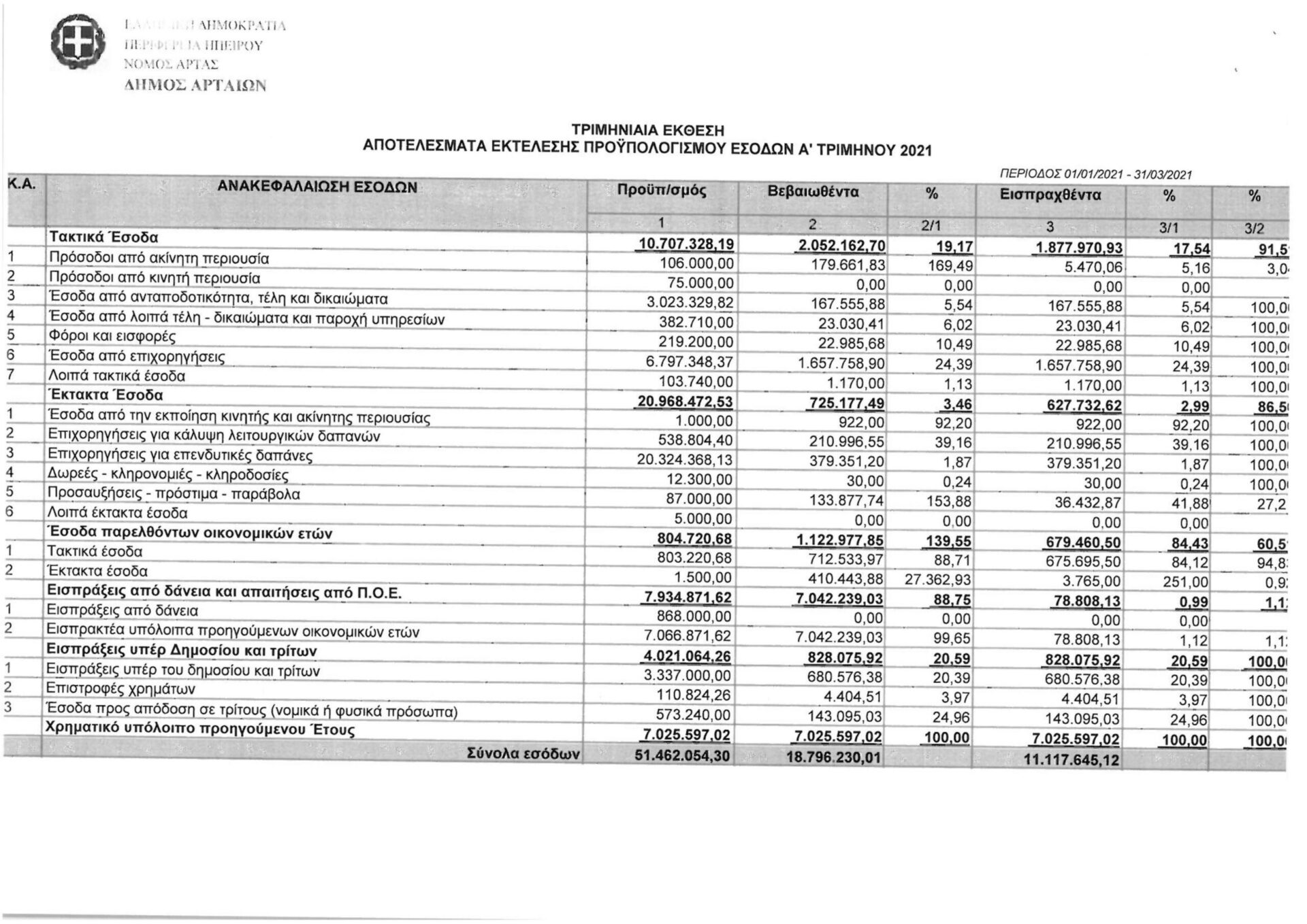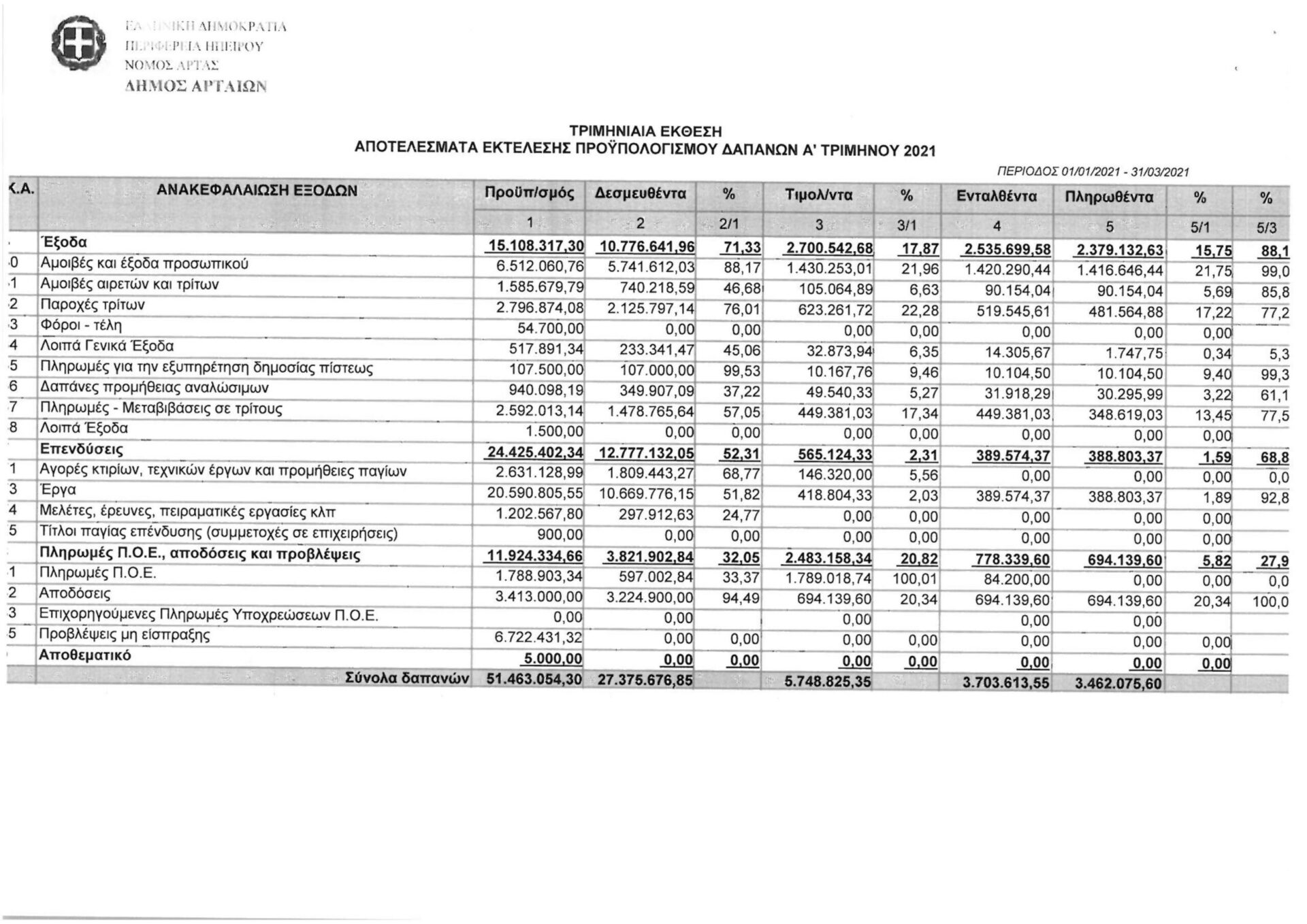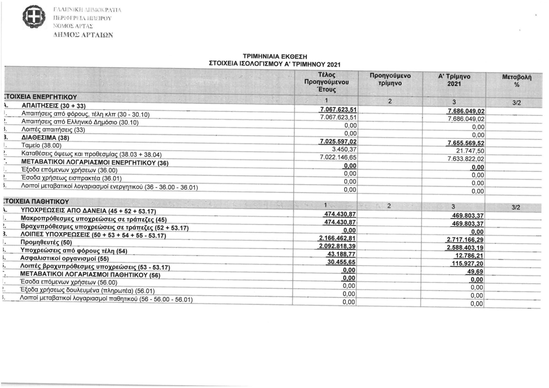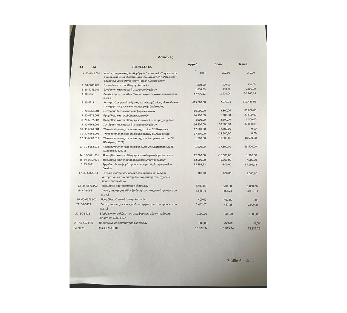 Στις αποφάσεις περιλαμβάνεται, μεταξύ άλλων: τη μεταφορά πίστωσης 800,00€ από τον ΚΑ 35-6051 με τίτλο «Εργοδοτικές εισφορές προσωπικού με σύμβαση Δημοσίου Δικαίου» διαμέσου του αποθεματικού κεφαλαίου ΚΑ -9111 στον ΚΑ 35-6262.011 με τίτλο «Εργασία συντήρησης αρδευτικού δικτύου και ελέγχου αυτοματισμών των συστημάτων άρδευσης στους χώρους πρασίνου του Δήμου» ενισχύοντας αυτόν. · τη μεταφορά πίστωσης 17.500,00 € από τον ΚΑ 30-6661.004 με τίτλο «Υλικά συντήρησης και επισκευής κτιρίων ΔΕ Βλαχερνών» διαμέσου του αποθεματικού κεφαλαίου ΚΑ -9111 στον ΚΑ 30-6662.012 με τίτλο «Υλικά συντήρησης και επισκευής λοιπών εγκαταστάσεων ΔΕ Βλαχέρνας (2021)» ενισχύοντας αυτόν · τη μεταφορά πίστωσης 17.500,00 € από τον ΚΑ 30-6661.005 με τίτλο «Υλικά συντήρησης και επισκευής κτιρίων ΔΕ Αμβρακικού» διαμέσου του αποθεματικού κεφαλαίου ΚΑ -9111 στον ΚΑ 30-6662.013 με τίτλο «Υλικά συντήρησης και επισκευής λοιπών εγκαταστάσεων ΔΕ Αμβρακικού (2021)» ενισχύοντας αυτόν Σελίδα 10 από 11 · τη μεταφορά πίστωσης 300,00 € από τον ΚΑ 10-6671.002 με τίτλο «Προμήθεια και τοποθέτηση ελαστικών» διαμέσου του αποθεματικού κεφαλαίου ΚΑ -9111 στον ΚΑ 15-6263.001 με τίτλο «Συντήρηση και επισκευή μεταφορικών μέσων» ενισχύοντας αυτόν, · τη μεταφορά πίστωσης 1.300,00 € από τον ΚΑ 20-6671.002 με τίτλο «Προμήθεια και τοποθέτηση ελαστικών» και τη μεταφορά πίστωσης 2.500,00 € από τον ΚΑ 20-6672.002 με τίτλο «Προμήθεια και τοποθέτηση ελαστικών λοιπών μηχανημάτων», ήτοι συνολική μεταφερόμενη πίστωση 3.800,00 € διαμέσου του αποθεματικού κεφαλαίου ΚΑ -9111 στον ΚΑ 20-6263.001 με τίτλο «Συντήρηση & επισκευή μεταφορικών μέσων» ενισχύοντας αυτόν, · τη μεταφορά πίστωσης 10.500,00 € από τον ΚΑ 30-6671.001 με τίτλο «Προμήθεια και τοποθέτηση ελαστικών μεταφορικών μέσων» διαμέσου του αποθεματικού κεφαλαίου ΚΑ -9111 στον ΚΑ 30-6263.001 με τίτλο «Συντήρηση και επισκευή μεταφορικών μέσων» ενισχύοντας αυτόν, · τη μεταφορά πίστωσης 5.000,00 € από τον ΚΑ 30-6672.001 με τίτλο «Προμήθεια και τοποθέτηση ελαστικών μηχανημάτων», πίστωσης 1.500,00 € από τον ΚΑ 35-6671.002 με τίτλο «Προμήθεια και τοποθέτηση ελαστικών», πίστωσης 400,00 € από τον ΚΑ 40-6671.002 με τίτλο «Προμήθεια & τοποθέτηση ελαστικών» και πίστωσης 600,00 € από τον ΚΑ 50-6671.001 με τίτλο «Προμήθεια και τοποθέτηση ελαστικών», ήτοι συνολική μεταφερόμενη πίστωση 7.500,00 € στο αποθεματικό κεφάλαιο ΚΑ -9111 ενισχύοντας αυτό. · τη μεταφορά πίστωσης 500,00 € από το αποθεματικό κεφάλαιο ΚΑ -9111 στον ΚΑ 50-6411 με τίτλο «Έξοδα κίνησης ιδιόκτητων μεταφορικών μέσων (καύσιμα, λιπαντικά, διόδια κλπ)» ενισχύοντας αυτόν. · τη μεταφορά πίστωσης 934,56 € από το αποθεματικό κεφάλαιο ΚΑ -9111 ως εξής : πίστωση 467,28 € στον ΚΑ 40-6063 με τίτλο «Λοιπές παροχές σε είδος (ένδυση εργατοτεχνικού προσωπικού κ.λ.π.)» και πίστωση 467,28 € στον ΚΑ 50-6063 με τίτλο «Λοιπές παροχές σε είδος (ένδυση εργατοτεχνικού προσωπικού κ.λ.π.)» ενισχύοντας αυτούς. Σελίδα 11 από 11 · τη μεταφορά πίστωσης 2.570,04 € από τον ΚΑ 20-6211 με τίτλο «Αντίτιμο ηλεκτρικού ρεύματος για φωτισμό οδών, πλατειών και κοινόχρηστων χώρων και παραγωγικής διαδικασίας» διαμέσου του αποθεματικού κεφαλαίου ΚΑ – 9111 στον ΚΑ 20-6063 με τίτλο «Λοιπές παροχές σε είδος (ένδυση εργατοτεχνικού προσωπικού κ.λ.π.)» ενισχύοντας αυτόν. · τη μεταφορά πίστωσης 82,53 € από το αποθεματικό κεφάλαιο ΚΑ -9111 στον ΚΑ 50-8115 με τίτλο «Λοιπές παροχές σε είδος (ένδυση εργατοτεχνικού προσωπικού κ.λ.π.)» ενισχύοντας αυτόν. · τη μεταφορά πίστωσης 250,00 € από το αποθεματικό κεφάλαιο ΚΑ -9111 σε νέο ΚΑ 00-6441.001 με τίτλ