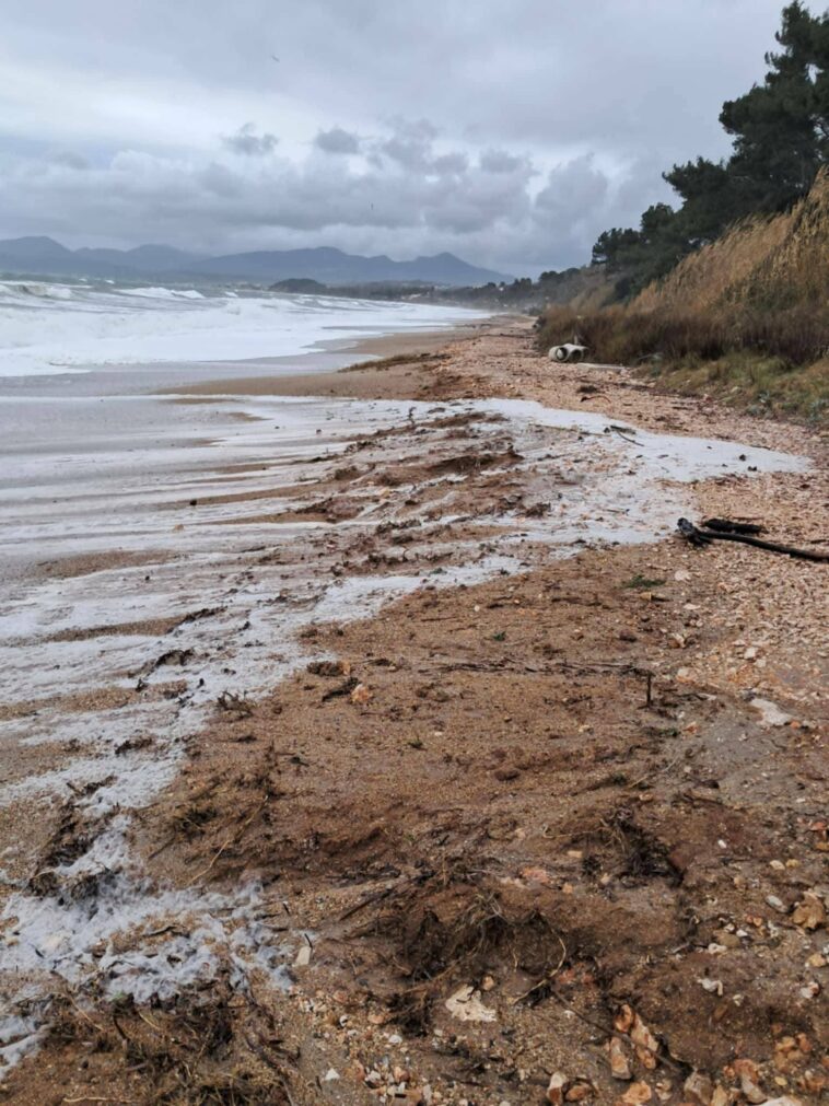 Συγκεκριμένα σε μεγάλη έκταση της μοναδικού φυσικού κάλλους ακτής, όπως ήταν αναμενόμενο και είχαμε σχετικά προειδοποιήσει, οι ογκόλιθοι και τα αδρανή που χρησιμοποιήθηκαν για το μπάζωμα και τη δημιουργία σταθερής υπόβασης της νέας οδού (Ποδηλατόδρομου) επί του αμμώδους εδάφους στη ζώνη αιγιαλού και παραλίας, έχουν αποκαλυφθεί και σημαντικό μέρος του υλικού έχει ολισθήσει και διασπαρεί στον αιγιαλό.