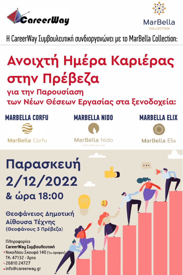ΑΝΟΙΧΤΗ ΗΜΕΡΑ ΚΑΡΙΕΡΑΣ συνδιοργανώνει για 3η χρονιά η CareerWay Συμβουλευτική Ανάπτυξης Ανθρώπινου Δυναμικού και Επιχειρηματικότητας, με τα Ξενοδοχεία της MarBella Collection και συγκεκριμένα: