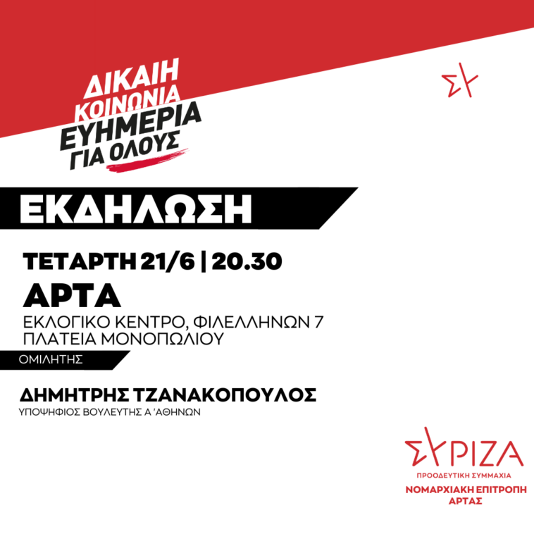 Στην πολιτική εκδήλωση με κεντρικό ομιλητή τον πρώην Γραμματέα του ΣΥΡΙΖΑ Π.Σ., Δημήτρη Τζανακόπουλο, σας προσκαλεί η Νομαρχιακή Επιτροπή Άρτας ΣΥΡΙΖΑ – ΠΣ.