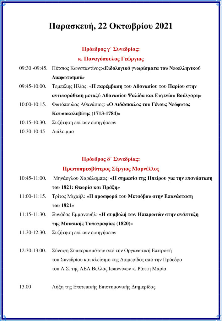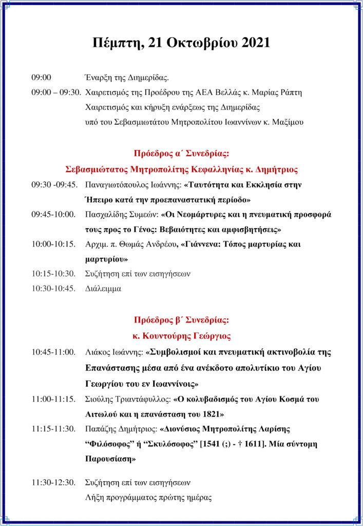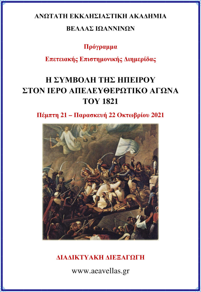 Η Ανώτατη Εκκλησιαστική Ακαδημία Βελλάς Ιωαννίνων συμμετέχοντας στους επετειακούς εορτασμούς για τα διακόσια χρόνια από την έναρξη της Ελληνικής Επαναστάσεως του 1821 διοργανώνει Επιστημονική Διημερίδα με γενικό θέμα: «Η προσφορά της Ηπείρου στον ιερό απελευθερωτικό αγώνα του 1821».