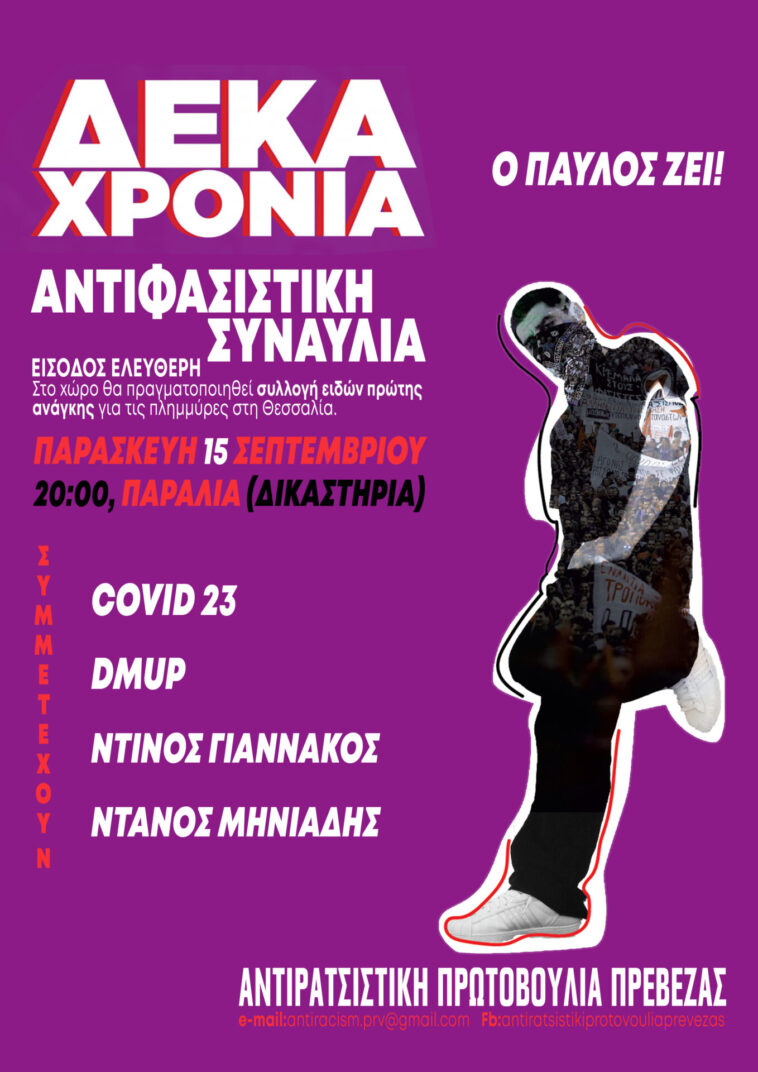 Την 18.09.2023 συμπληρώνονται δέκα χρόνια από τη νύχτα που το τάγμα εφόδου της Χρυσής Αυγής δολοφόνησε τον Παύλο Φύσσα. Δέκα χρόνια από τη νύχτα που ο Παύλος δεν έκανε βήμα πίσω στη θέαση του ναζιστικού τάγματος και στάθηκε όρθιος για να υπερασπιστεί τους φίλους του, τη σύντροφό του, την οικογένεια του, τη γειτονιά του, την ιστορία μας, όλους/ες μας. Δέκα χρόνια από τη νύχτα που ο Παύλος δεν υπέκυψε στο φόβο και δε δίστασε να έρθει αντιμέτωπος με το οργανωμένο τάγμα των νεοναζί. Δέκα χρόνια από τη νύχτα που η στάση του Παύλου καθόρισε τους αντιφασιστικούς αγώνες, διαμόρφωσε το αντιφασιστικό φρόνημα των επόμενων γενεών και αποτέλεσε την αρχή μιας μακράς και επίπονης διαδικασίας που είχε ως αποτέλεσμα την καταδίκη των φασιστών της Χ.Α. σε δικαστικό επίπεδο, αλλά και την πάταξη των οπαδών του φασισμού σε κάθε γειτονιά της Ελλάδας.