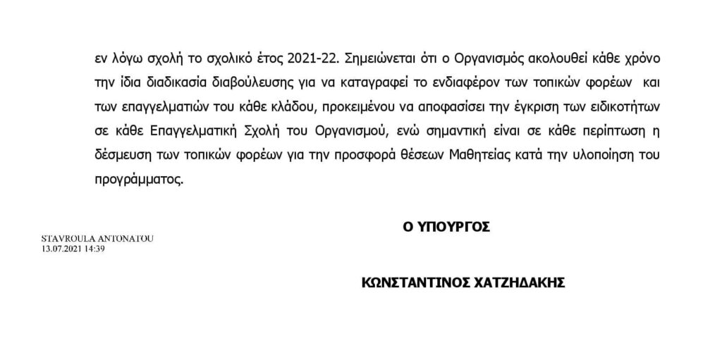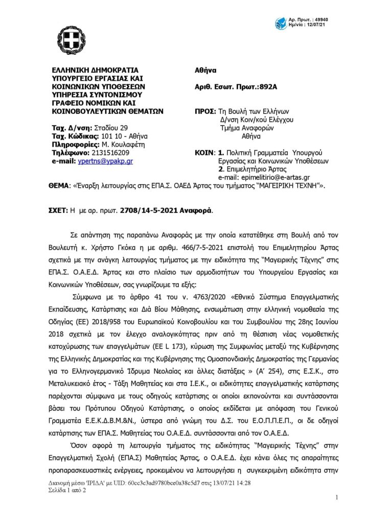 Από τον Υπουργό Εργασίας και Κοινωνικών Υποθέσεων, κ. Κ. Χατζηδάκη, δόθηκε η υπ’ αριθμ.: 49940/12-07-2021, απάντηση σε αναφορά που κατέθεσε ο Βουλευτής του Κινήματος Αλλαγής Άρτας, κ. Χρήστος Γκόκας στις 14-05-21, με βάση την υπ’ αριθμ.: 466/07-05-2021 επιστολή του Επιμελητηρίου Άρτας.