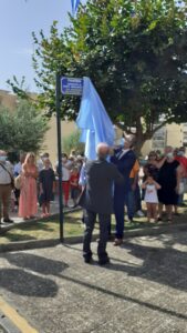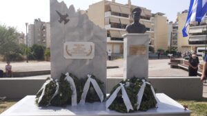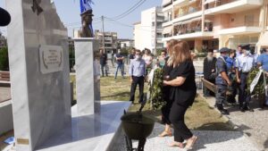 Προηγήθηκε επιμνημόσυνη δέηση και στην συνέχεια κατάθεση στέφανων από τους Φορείς και την οικογένεια του Σμηναγού στο μνημείο στην προτομή του.