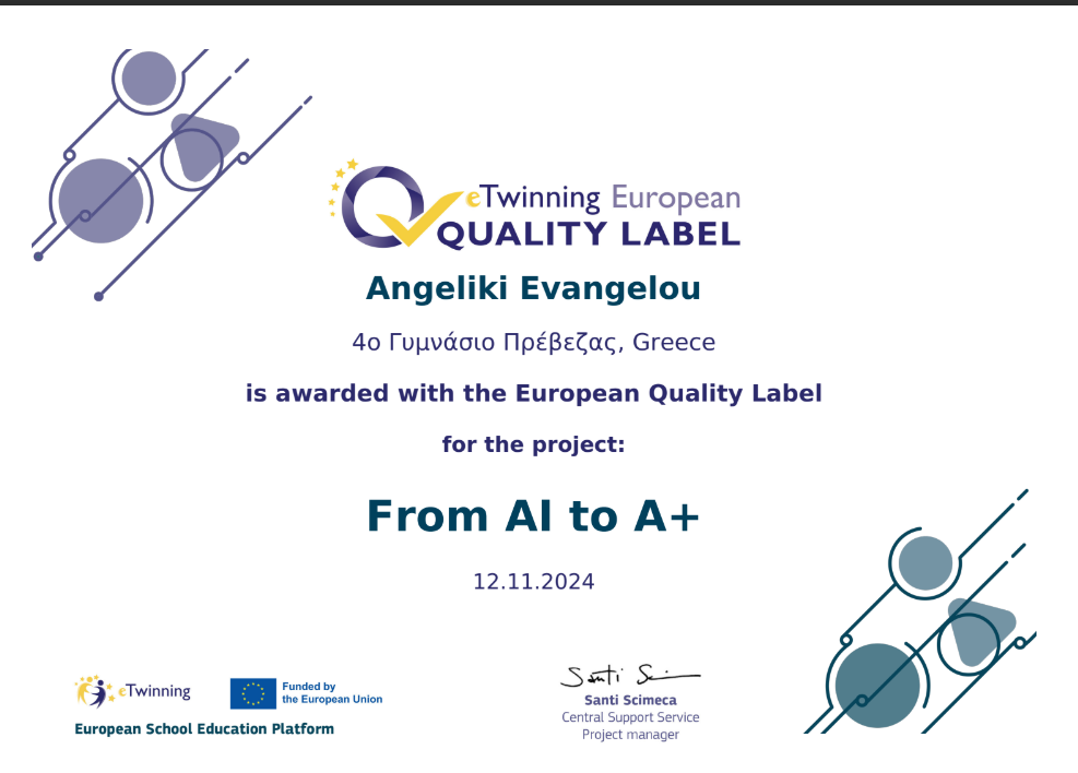 Η παιδαγωγική ομάδα του 4ου Γυμνασίου Πρέβεζας (τρεις εκπαιδευτικοί και δεκαεννέα μαθητές) υλοποίησε δραστηριότητες στο πλαίσιο του Ευρωπαϊκού προγράμματος eTwinning “From AI to A+”. Το 4 ο Γυμνάσιο Πρέβεζας ήταν ο συνιδρυτής του προγράμματος με ιδρυτή το Κροατικό σχολείο OŠ Sesvetski Kraljevec που εδρεύει στο Ζάγκρεμπ. Συγκεκριμένα στο πρόγραμμα συμμετείχαν 22 εκπαιδευτικοί, και 140 μαθητές από επτά ( 7 ) συνολικά χώρες : Ελλάδα, Κροατία, Ρουμανία, Ισπανία, Γεωργία, Ιταλία και Σερβία.