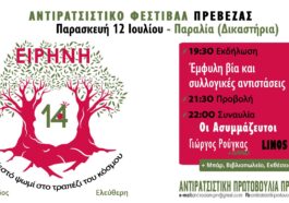 14ο ΑΝΤΙΡΑΤΣΙΣΤΙΚΟ ΦΕΣΤΙΒΑΛ ΠΡΕΒΕΖΑΣ – «Ειρήνη – Το ζεστό ψωμί στο τραπέζι του κόσμου» – Παρασκευή 12 Ιουλίου Παραλία (Δικαστήρια)