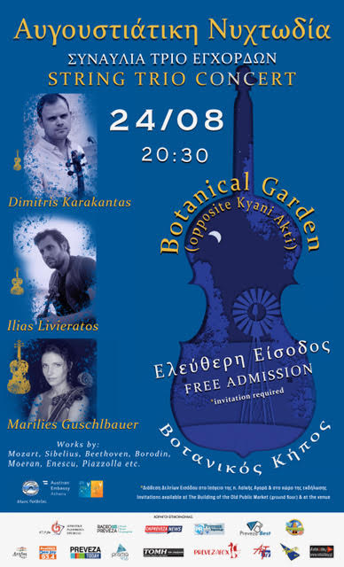 Η βραδιά κλασσικής μουσικής διοργανώνεται από τον Δήμο Πρέβεζας και τίθεται υπό την αιγίδα της Αυστριακής Πρεσβείας στο πλαίσιο του project “Ελληνοαυστριακό Μουσικό Καλοκαίρι”. Οι θεμελιώδεις ιδέες που διέπουν τις εκδηλώσεις είναι ο διάλογος μεταξύ Aυστριακών και Eλλήνων επαγγελματιών του πολιτιστικού τομέα, η ποικιλομορφία μέσω των διαφόρων ειδών μουσικής και η φιλία μεταξύ Αυστρίας και Ελλάδας.