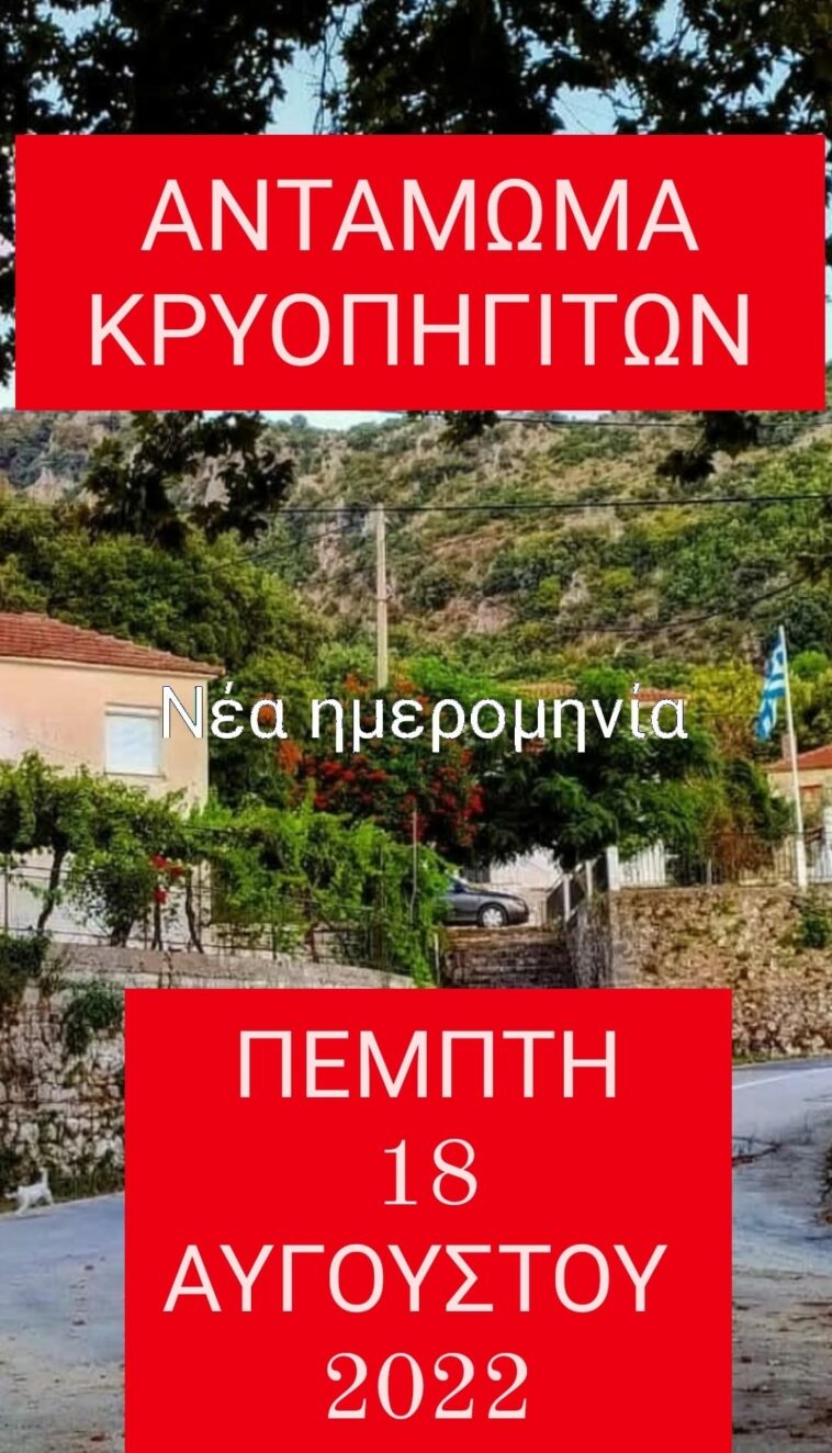 Έπειτα από την αναβολή λόγω φόβου για άστατες καιρικές συνθήκες την προηγούμενη εβδομάδα το Αντάμωμα των Κρυοπηγητών τελικώς θα πραγματοποιηθεί αύριο Πέμπτη 18 Αυγούστου στην πλατεία του ιστορικού & μαρτυρικού χωριού της Δημοτικής Ενότητας Ζαλόγγου.