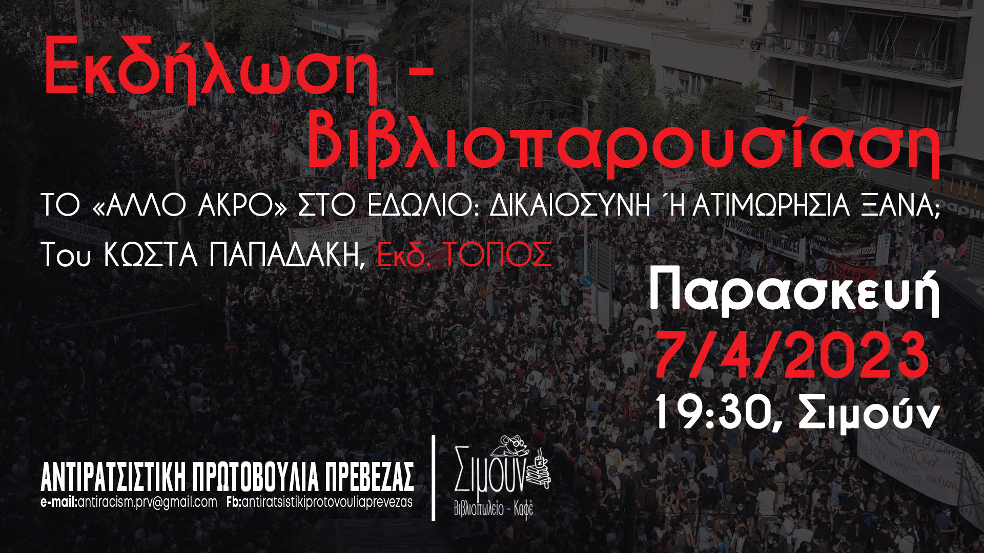 Εκδήλωση – Βιβλιοπαρουσίαση 7 Απριλίου, “Το άλλο άκρο στο εδώλιο. Δικαιοσύνη ή ατιμωρησία ξανά;” του Κώστα Παπαδάκη, Εκδόσεις “Τόπος”