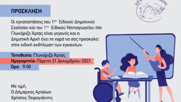 Εγκαινιάζονται επισήμως την Πέμπτη 21 Δεκεμβρίου, οι εγκαταστάσεις του 1ου Ειδικού Δημοτικού Σχολείου και του 1ου Ειδικού Νηπιαγωγείου στο Γλυκόριζο Άρτας