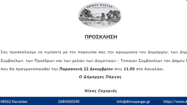 Πρόσκληση ορκωμοσίας του Δημάρχου, των Δημοτικών Συμβούλων, των Προέδρων και των μελών των Δημοτικών – Τοπικών Συμβουλίων του Δήμου Πάργας
