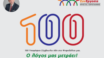 100 υποψηφιότητες συμπλήρωσε το ψηφοδέλτιο της «Αρτινών Συνεργασία» Χρήστος Τσιρογιάννης «Σπάσαμε το κοντέρ των πρώτων 100 υποψηφιοτήτων, το βράδυ των αυτοδιοικητικών εκλογών θα σπάσουμε το κοντέρ της νίκης»