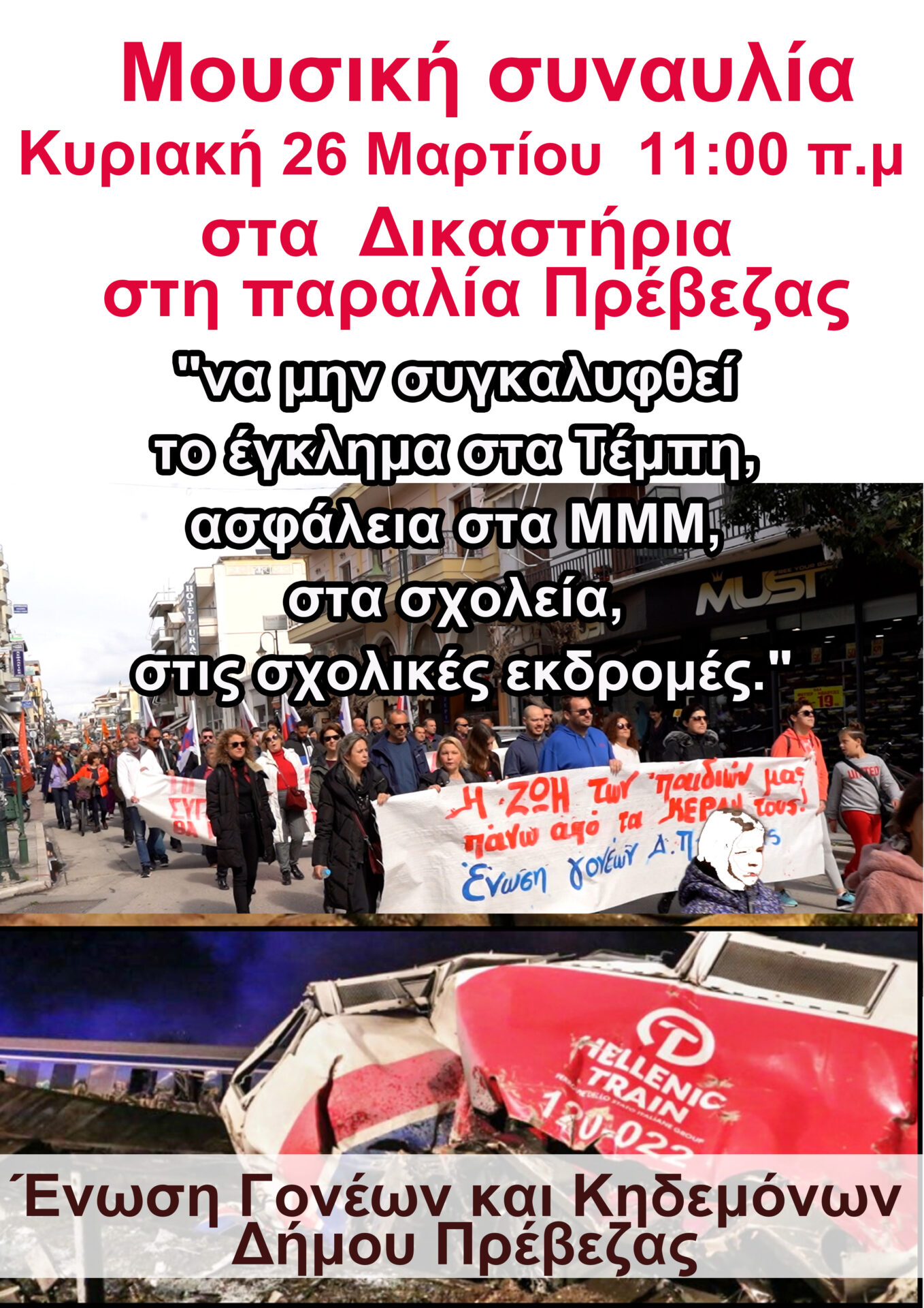 Μουσική Συναυλία 26 Μαρτίου στις 11 στα Δικαστήρια_ Να μην συγκαλυφθεί το έγκλημα στα Τέμπη, ασφάλεια στα σχολεία στα ΜΜΜ