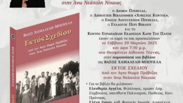 Ανακοίνωση της Ένωσης Λογοτεχνών Πρέβεζας για την παρουσίαση του νέου βιβλίου «Εκτός Σχεδίου» της Βάσως Χαμαλέλη-Μπούκλα