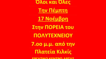 ΚΑΛΕΣΜΑ ΤΟΥ ΕΡΓΑΤΙΚΟΥ ΚΕΝΤΡΟΥ ΑΡΤΑΣ | Η ιστορία γράφεται με ανυπακοή – Όλες και όλοι στην Πορεία για την επέτειο του Πολυτεχνείου – Πέμπτη 17 Νοέμβρη στις 7.00 μ.μ. από την πλατεία Κιλκίς