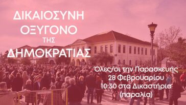 Συγκέντρωση για τα Τέμπη – Η ΔΙΚΑΙΟΣΥΝΗ ΟΞΥΓΟΝΟ ΤΗΣ ΔΗΜΟΚΡΑΤΙΑΣ – όλες/οι Όλες, όλοι Παρασκευής 28 Φεβρουαρίου στις 10:30 στα Δικαστήρια (παραλία)