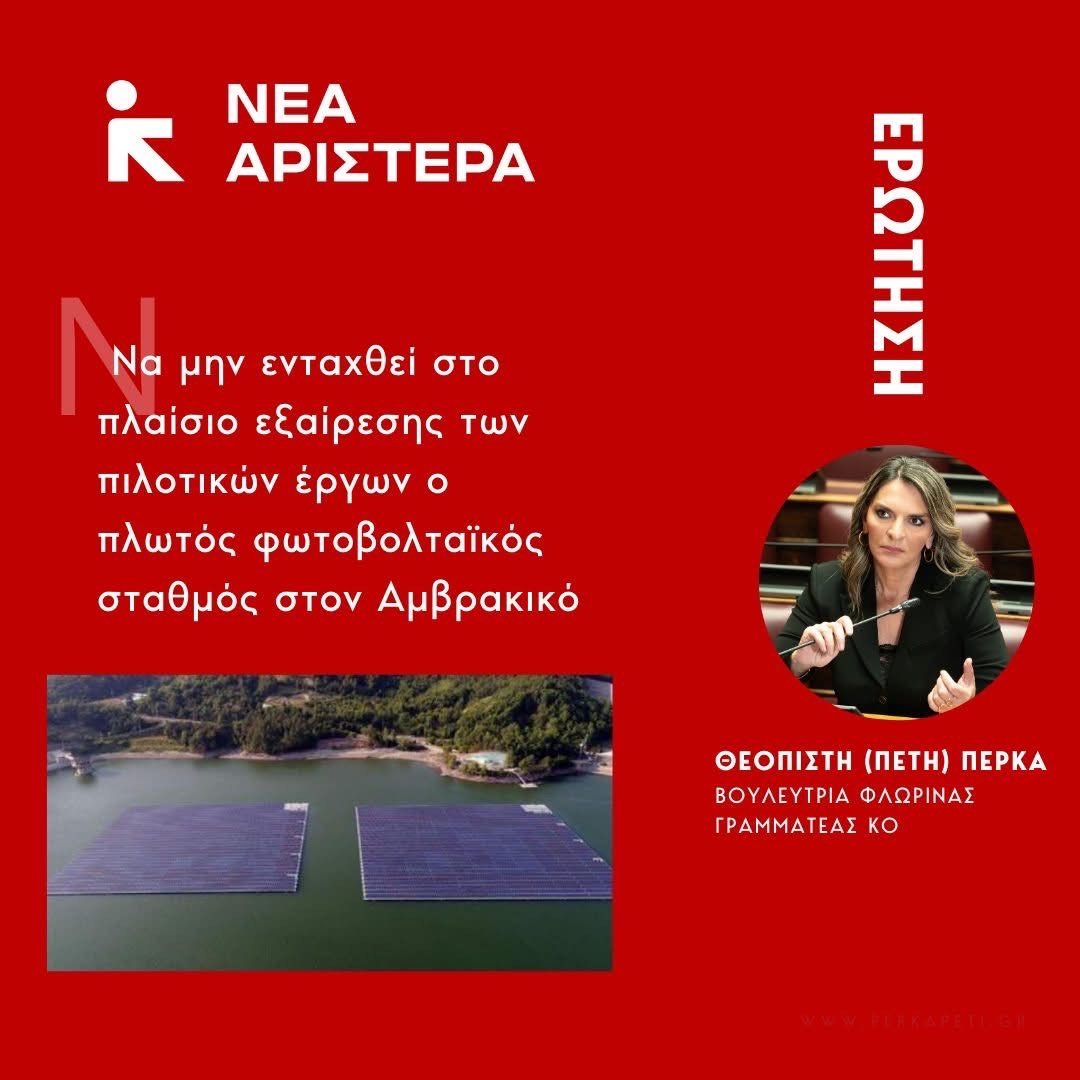 ΝΕΑ ΑΡΙΣΤΕΡΑ : «Να μην ενταχθεί στο πλαίσιο εξαίρεσης των πιλοτικών έργων ο πλωτός φωτοβολταϊκός σταθμός στον Αμβρακικό»
