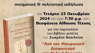Ανακοίνωση της Ένωσης Λογοτεχνών Πρέβεζας για την παρουσίαση του βιβλίου του Σωκράτη Βασιλείου «Από τον Ηπειρωτικό Διαφωτισμό στη Φιλική Εταιρεία-Ηπειρώτες Φιλικοί»