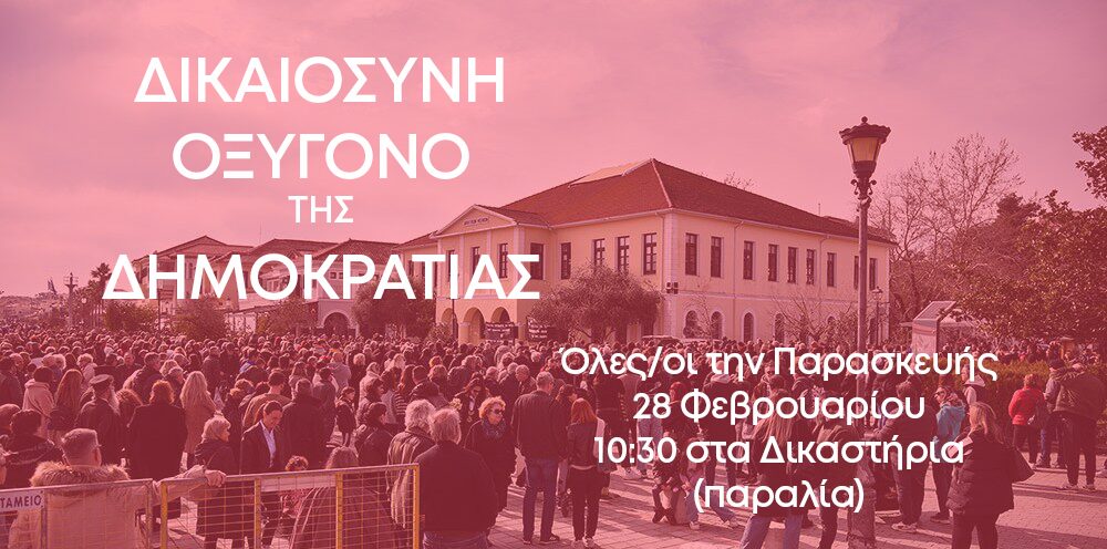 Συγκέντρωση για τα Τέμπη – Η ΔΙΚΑΙΟΣΥΝΗ ΟΞΥΓΟΝΟ ΤΗΣ ΔΗΜΟΚΡΑΤΙΑΣ – όλες/οι Όλες, όλοι Παρασκευής 28 Φεβρουαρίου στις 10:30 στα Δικαστήρια (παραλία)
