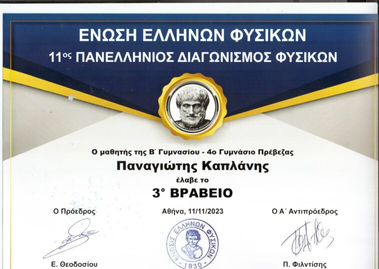 Η Διεύθυνση και ο Σύλλογος Διδασκόντων του 4ου Γυμνασίου Πρέβεζας συγχαίρει το μαθητή της Γ΄ Τάξης Καπλάνη Παναγιώτη του Σπυρίδωνος για τη διάκριση του στον Πανελλήνιο Διαγωνισμό Φυσικής 2023 .