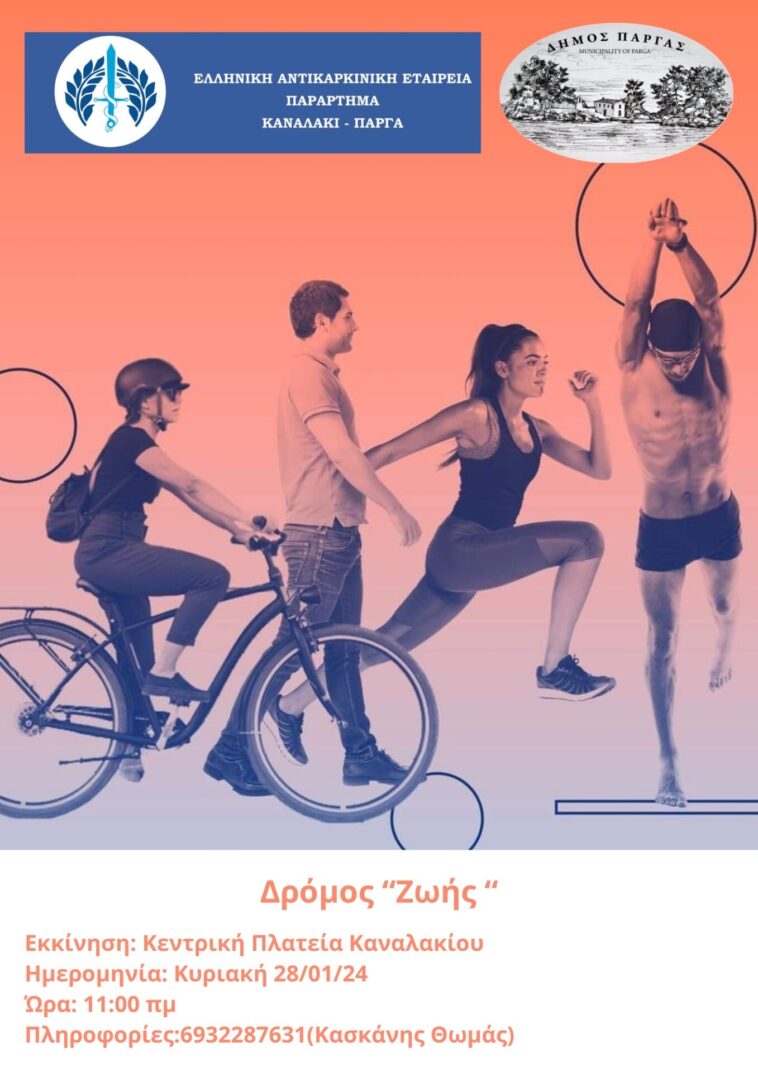 Ο Δήμος Πάργας και η Ελληνική Αντικαρκινική Εταιρεία Παράρτημα Καναλακίου – Πάργας στα πλαίσια δράσεων ευαισθητοποίησης κατά του Καρκίνου, διοργανώνουν την Κυριακή 28/1 στις 11.00 συμβολικό ποδηλατικό γύρο και πεζοπορία με ελεύθερη συμμετοχή και σημείο εκκίνησης την Πλατεία Καναλακίου. Στο ατομικό Virtual 5k Challenge που θα πραγματοποιηθεί, καλούνται να συμμετέχουν όλοι ανεξάρτητα από την ηλικία και την φυσική τους κατάσταση, ώστε με την προσπάθεια τους να διαδοθεί το μήνυμα της πρόληψης κατά του Καρκίνου.