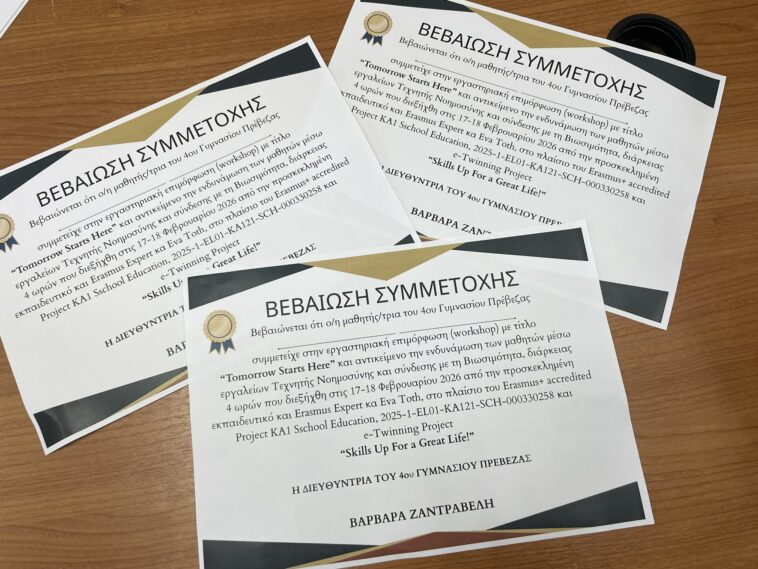 Με ιδιαίτερη επιτυχία πραγματοποιήθηκε στο 4ο Γυμνάσιο Πρέβεζας το τριήμερο εργαστήριο Erasmus+ με τίτλο «Tomorrow Starts Here – Future-Proof Teaching in Action :AI, Sustainability and Active Citizenship in Action», με προσκεκλημένη ειδικό (Erasmus+ Invited Expert) την κα. Eva Toth από την Ουγγαρία στο πλαίσιο διαπιστευμένου σχεδίου Erasmus , 2025-1-EL01-KA121-SCH-000330258 , Σχολικό Έτος 2025-26 .