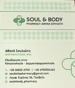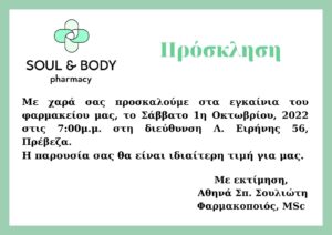 Το νέο Φαρμακείο ‘Body & Soul’ άνοιξε τις πύλες του σε καλαίσθητο και άριστα οργανωμένο χώρο επί της Λ. Ειρήνης 56 στην Πρέβεζα. Φαρμακοποιός, η Αθηνά η Σουλιώτη, ‘γέννημα–θρέμμα’ της πόλης μας, κόρη του γνωστού επιχειρηματία Σπύρου Σουλιώτη και της εκπαιδευτικού, Μουσικού, Θάλειας Βαγγέλη.