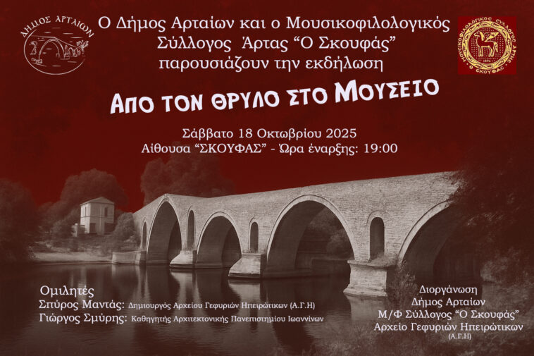 Μια σπουδαία εκδήλωση με τίτλο «Από τον Θρύλο στο Μουσείο», συνδιοργανώνουν το Σάββατο 18 Οκτωβρίου 2025 και ώρα 19:00, στην αίθουσα «Σκουφάς», ο Δήμος Αρταίων, ο Μουσικοφιλολογικός Σύλλογος Άρτας «Ο Σκουφάς» και το Αρχείο Γεφυριών Ηπειρώτικων (Α.Γ.Η.)