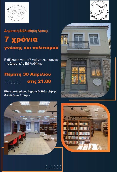 Ο Δήμος Αρταίων και ο Σύλλογος «Φίλοι του Βιβλίου» διοργανώνουν την επετειακή εκδήλωση για τη συμπλήρωση 7 ετών λειτουργίας της Δημοτικής Βιβλιοθήκης Άρτας.