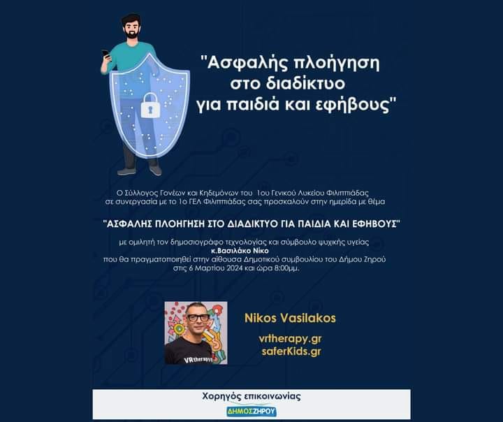 Ο Σύλλογος Γονέων και Κηδεμόνων του 1ου ΓΕΛ Φιλιππιάδας σε συνεργασία με το Δήμο Ζηρου και το 1ο ΓΕΛ Φιλιππιάδας πραγματοποιούν την Τετάρτη 6 Μαρτίου εκδήλωση με θέμα την Ασφαλή Πλοήγηση στο Διαδίκτυο για παιδια και εφήβους.