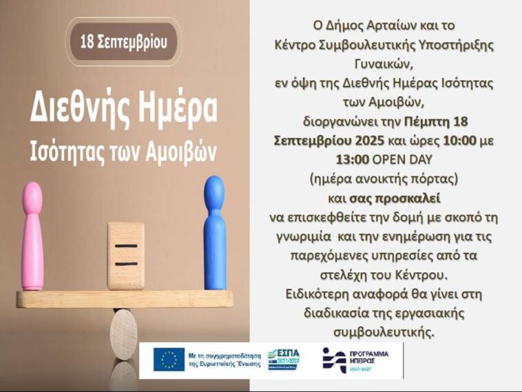 Διεθνής Ημέρα Ισότητας των Αμοιβών – Εκδήλωση Open Day από τον Δήμο Αρταίων και το Συμβουλευτικό Κέντρο Γυναικών